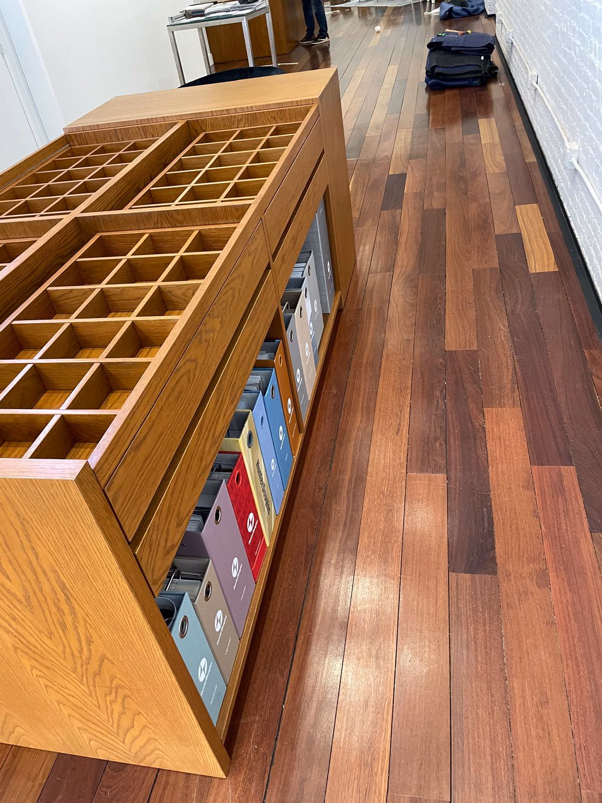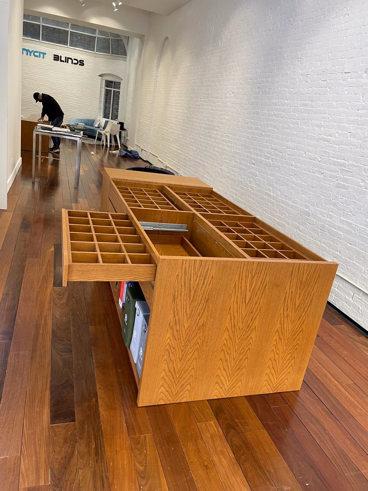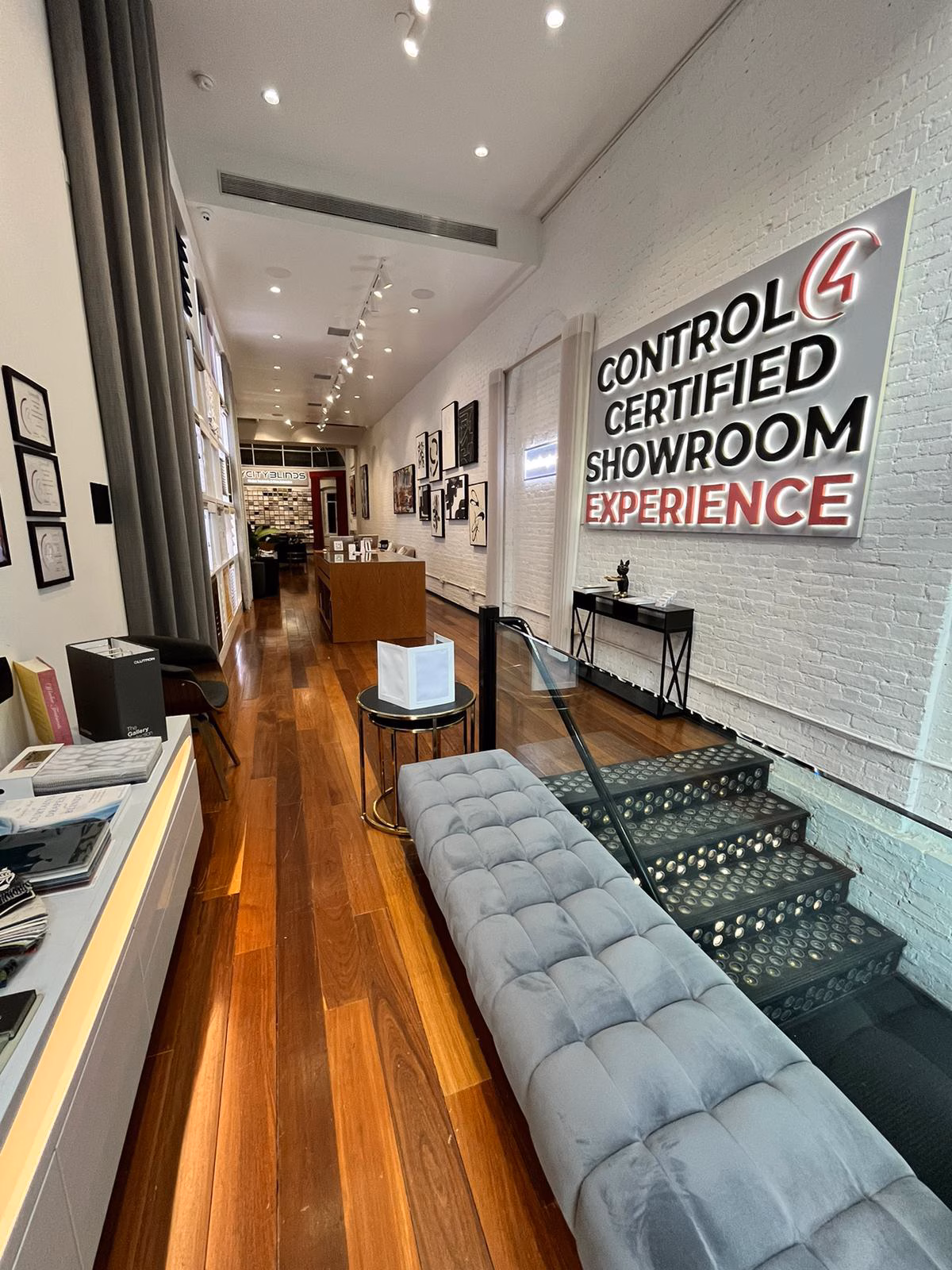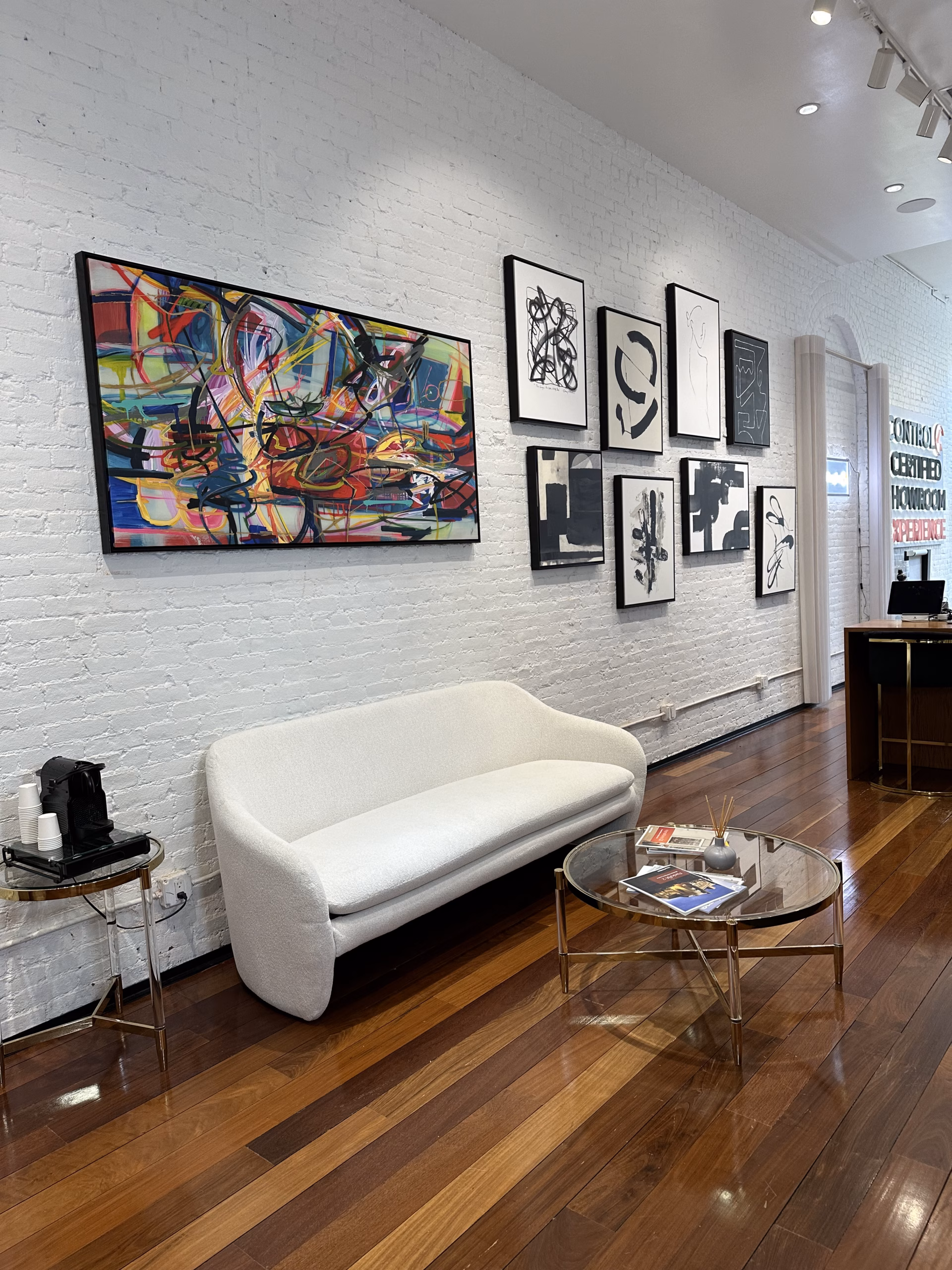 We executed a full interior refresh including a comprehensive paint program, custom wallpaper installation, and refinishing existing hardwood floors to create a cohesive, high-end foundation. Locally fabricated wood elements were integrated throughout to add warmth and character, paired with strategically curated artwork to elevate the visual experience. To support operations, we constructed a finished basement for storage and efficiency, and completed custom glasswork for staircases and railings alongside targeted electrical upgrades to enhance the scale, lighting, and overall perception of the showroom. We also managed procurement of all required design materials to ensure every detail aligned with the brand’s standards.