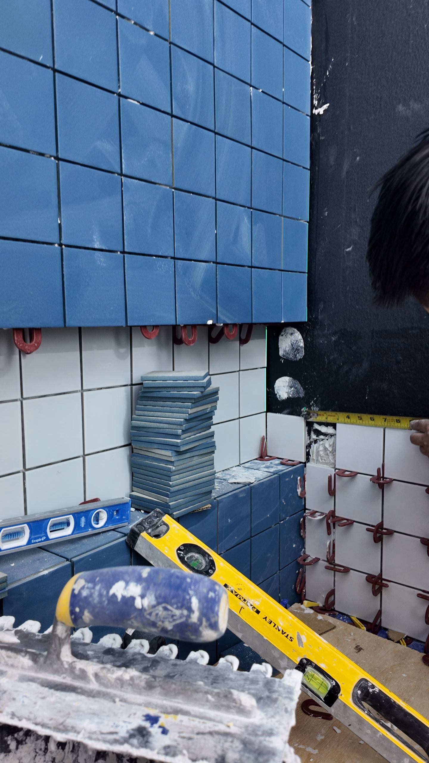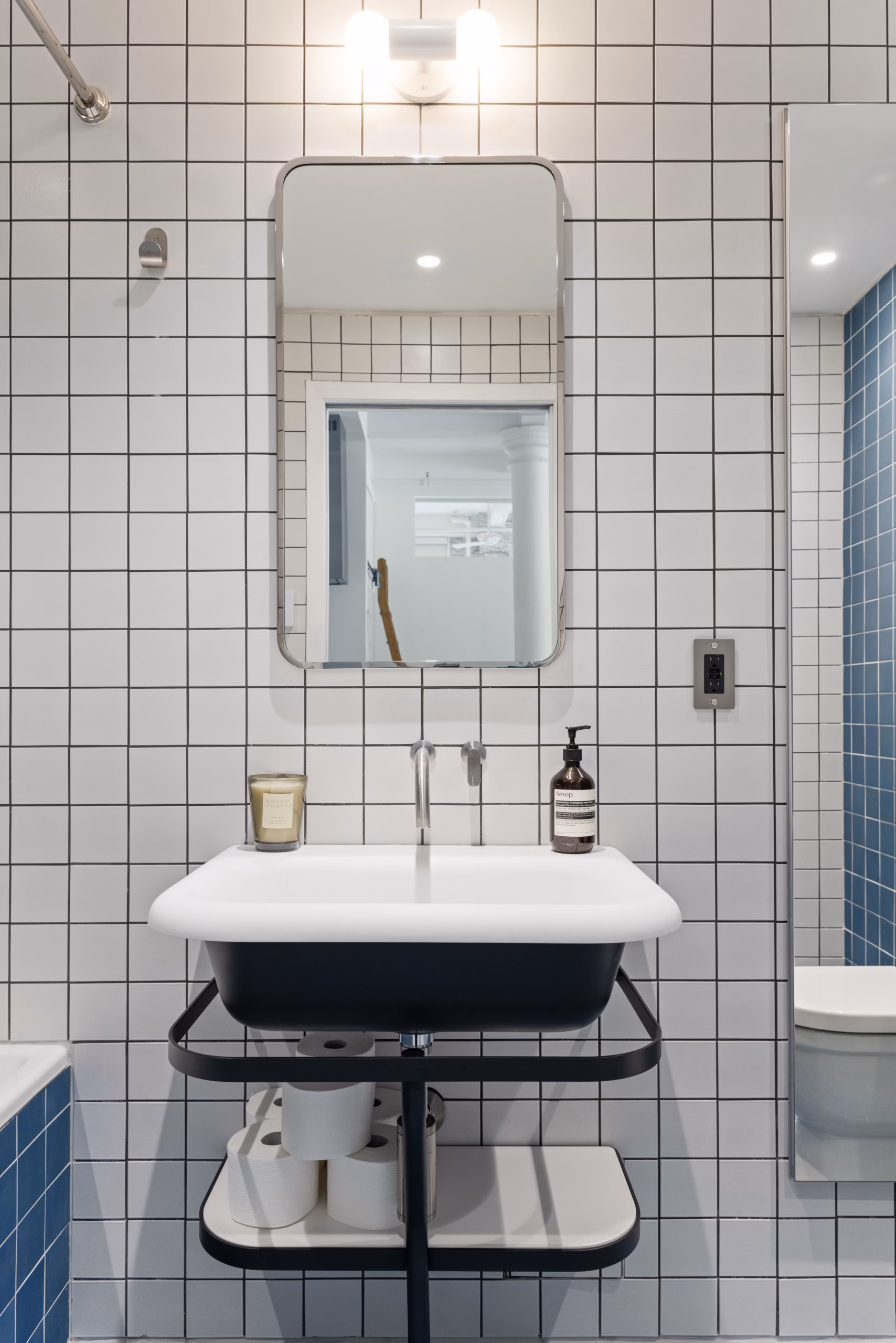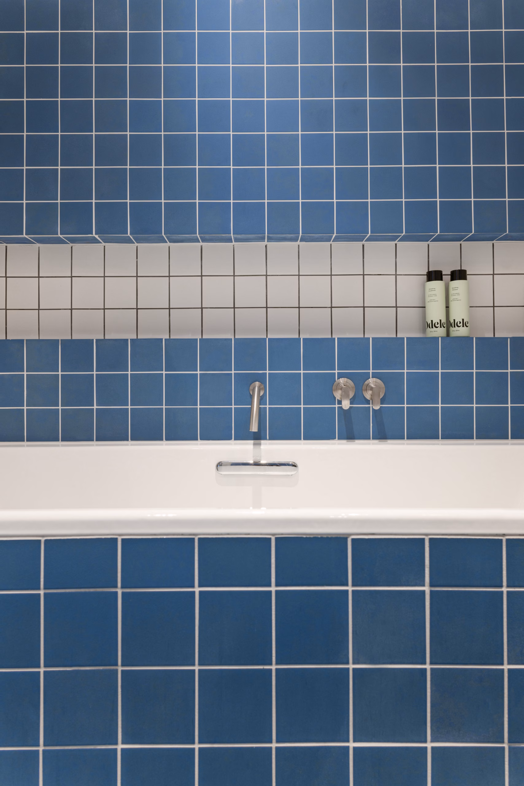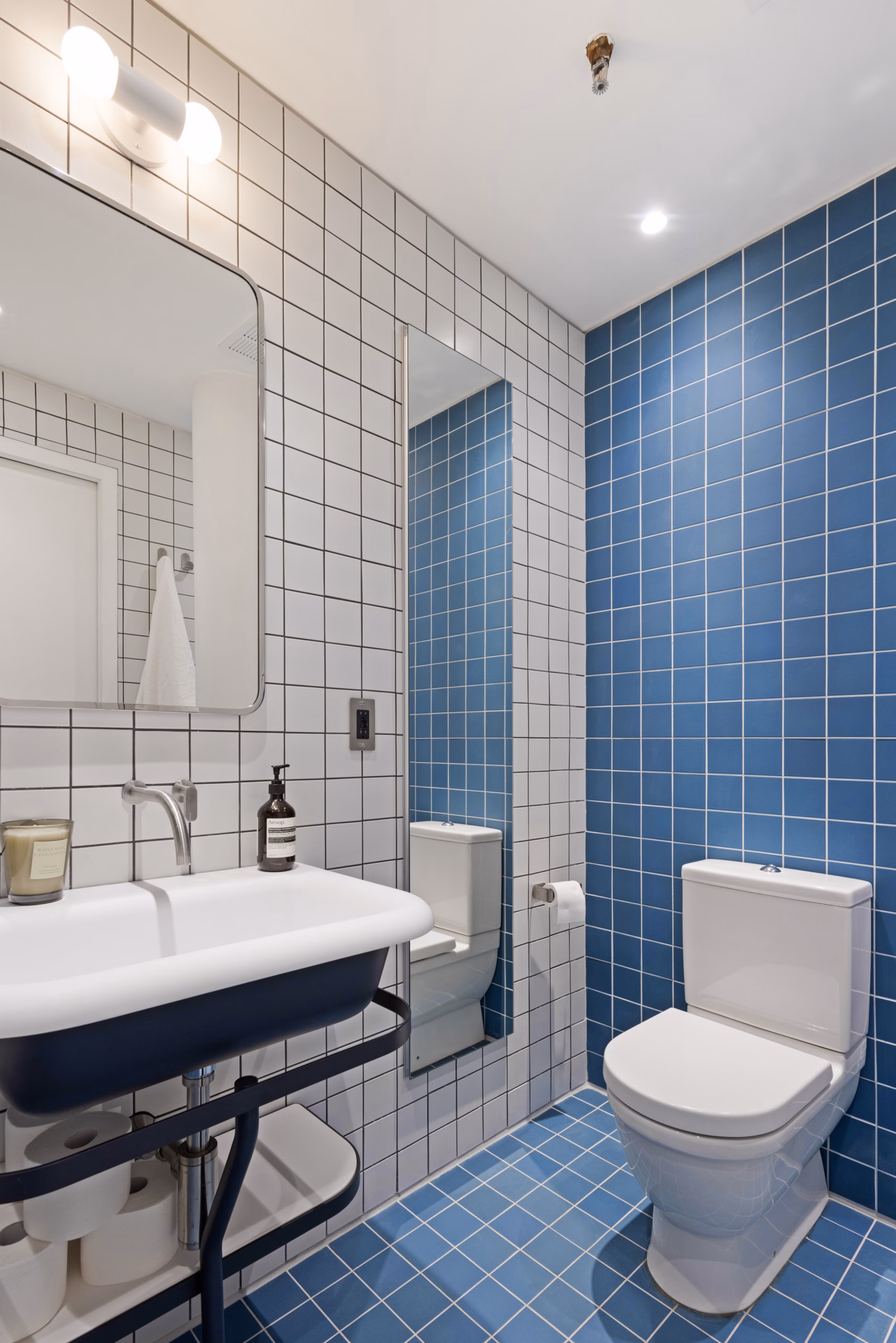 The design focused on light, color, and durability — using blue-and-white Zia tiles to add personality while tying back to the master bathroom. Cocoon fixtures, Buster & Punch electricals, and a Robern luxury vanity kept the finish level consistent across both spaces.